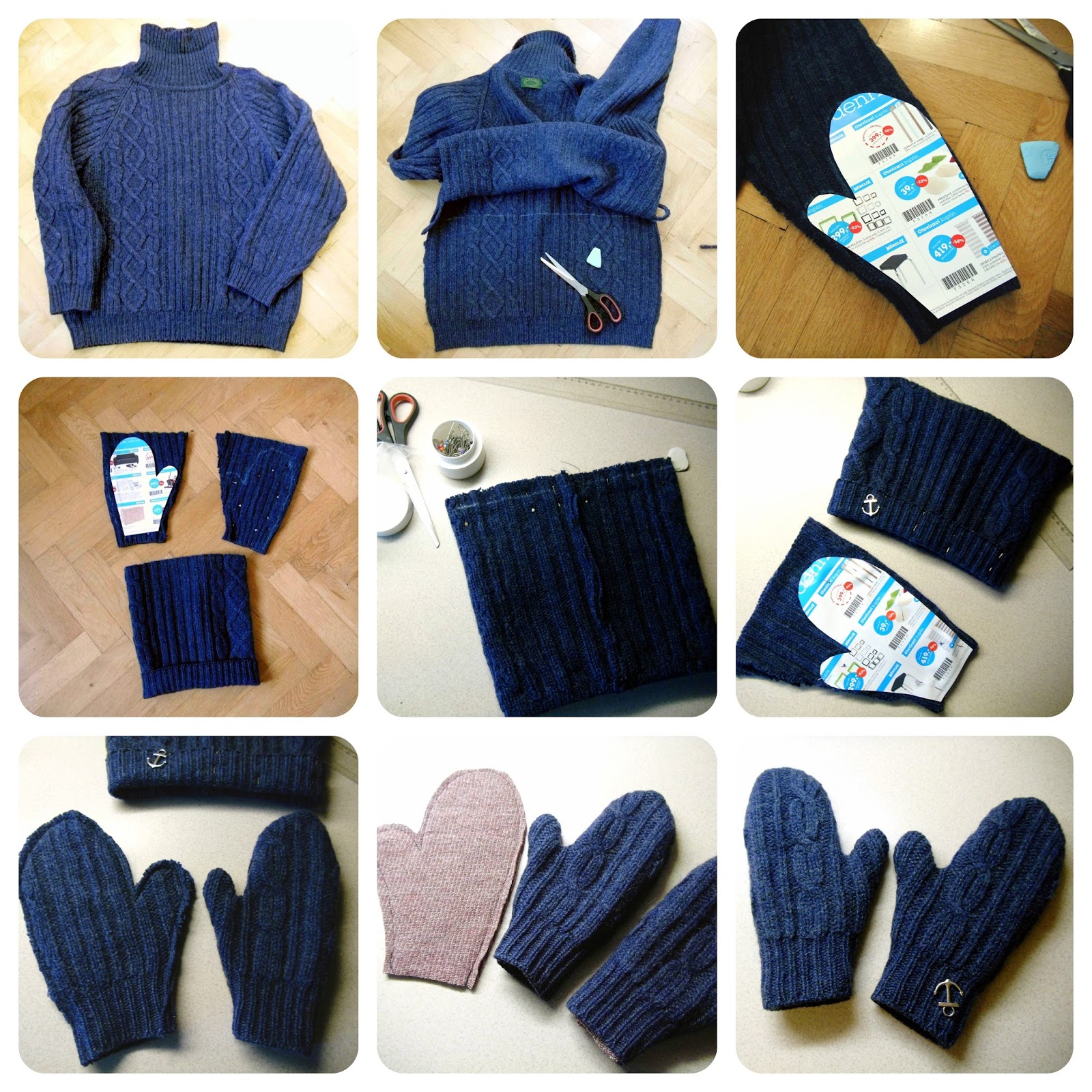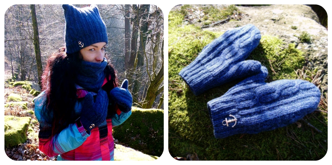 Palčáky jsou vytvořeny z rukávů svetru. Střih je jednoduchý, stačí obkreslit ruku, dát tomu nějaký rukavicový vzhled a trochu zvětšit. Lemy palčáků jsou opět vytvořeny lemem rukávů svetru. Mám věčně zmrzlé ruce, ušila jsem proto do rukavic ještě jednu teplou vložku, všila dovnitř a hotovo!