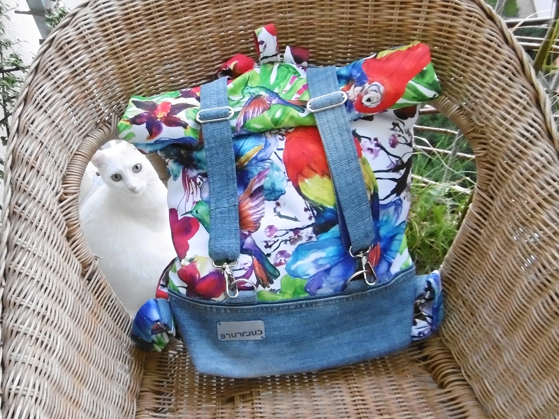 Zkombinovala jsem džínovinu (konkrétně dno batohu je ze starých riflí) a potištěnou kočárkovinu. Tomu potisku prostě nešlo odolat a možná jsme už zaznamenali, že z ní mám ušitý i cestovní organizér.