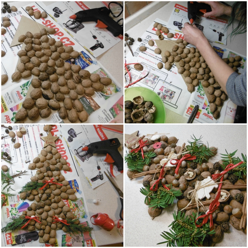 Potřebujeme: karton, tavnou pistoli a dostatek náplní (lepit se fakt opravdu dost), vlašské a lískové ořechy, korálky, šišky, stuhu, chvojí, skořici, dřevěné, papírové nebo jiné dekorace