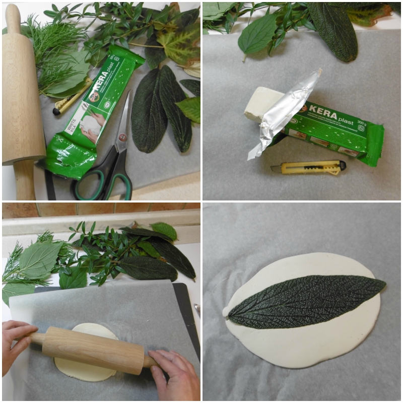 Hlínu jsem vyválela jako těsto na plát a prvním pokusem byly hliněné listy (tento nápad jsem nedávno viděla na netu a tak se mi líbil, že jsem to musela zkusit). Do hlíny jsem jednoduše listy obtiskla, vykrojila tvar a okraje trochu ohnula nahoru, aby připomínaly opravdové listy.